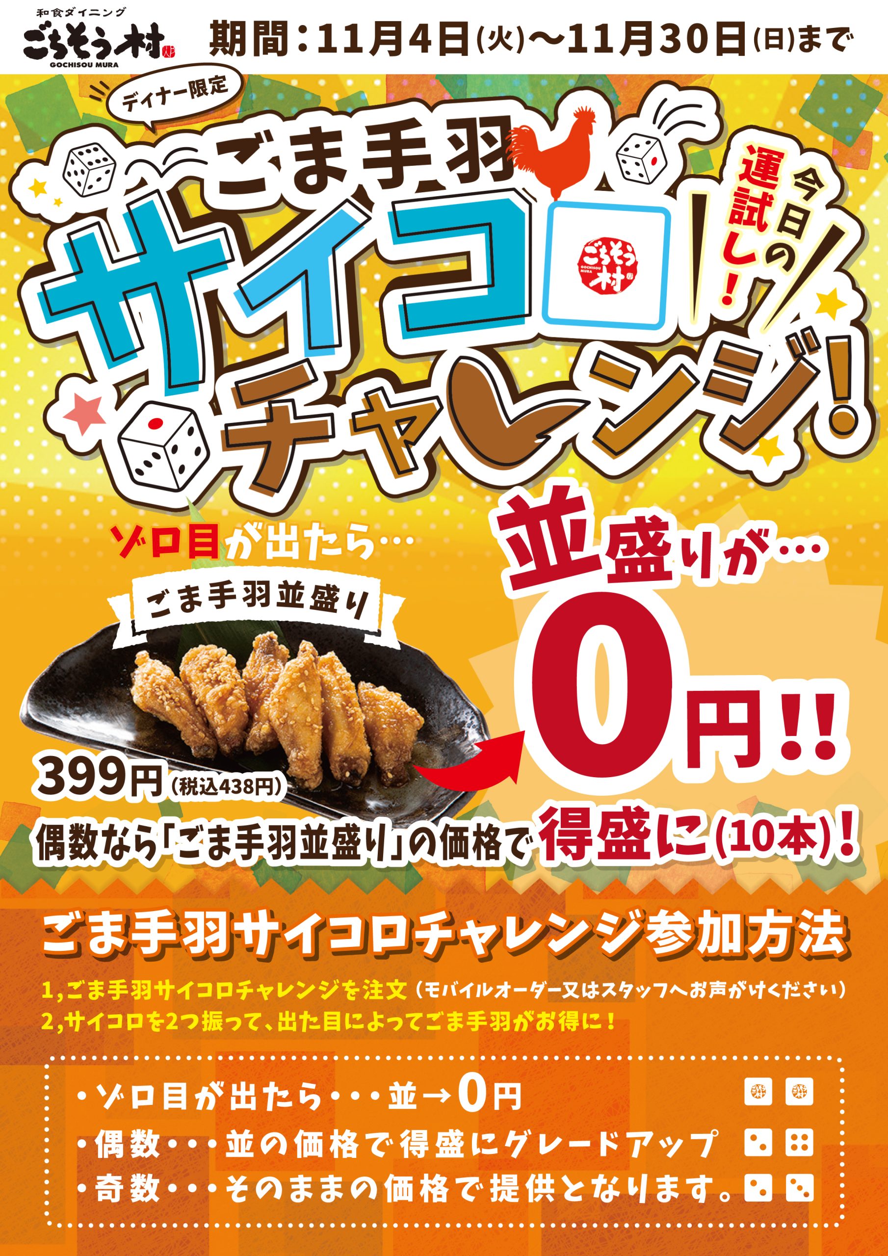 内容:「ごま手羽サイコロチャレンジ」をご注文後、サイコロを2つ振っていただき、出た目に応じてご提供内容が変わります!